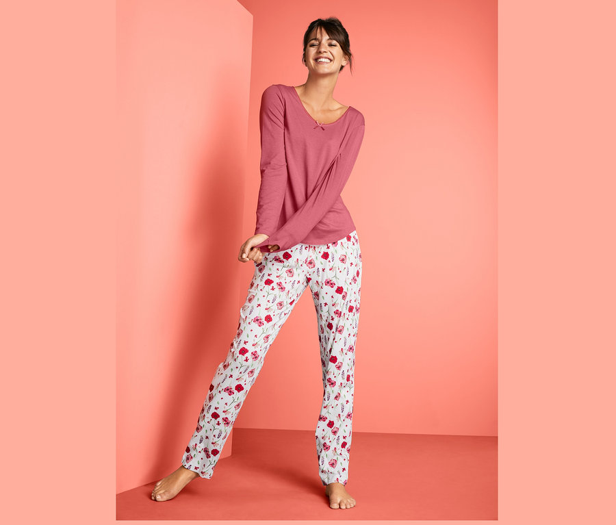 Das Shirt ist mit V-Ausschnitt und abgerundetem Saum geschnitten und mit einer Wäscheschleife versehen, die Hose mit verspielt-romantischem Blumenmuster hat eine dekorative Knopfleiste und einen bequemen, elastischen Bund.