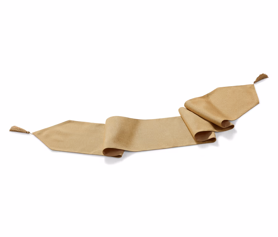 Ein besonderer Anlass verlangt auch nach einem besonders gedeckten Tisch – und eine besondere Tischdecke kann meistens auch noch eine besondere Begleitung vertragen. Wie diesen Tischläufer, der mit goldglänzendem Garn gearbeitet ist – perfekt für die festliche Tafel. Er hat spitz zulaufende Enden mit Tasseln, die je nach Geschmack auch abgenommen werden können. Der Läufer eine Länge von etwa zwei Metern und eignet sich dadurch auch für etwas größere Tische. Man kann ihn mit oder ohne Tischdecke nutzen – am schönsten kommt er aber auf einer edlen Tischdecke zur Geltung.