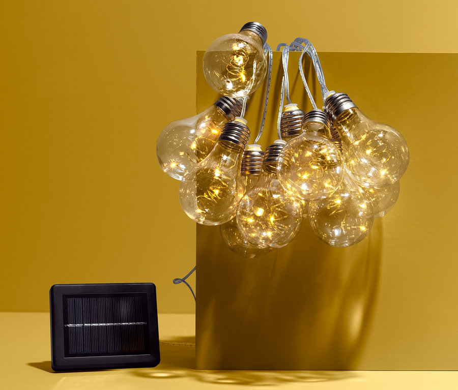 Für gemütliches Licht auf der Terrasse oder dem Balkon: Diese Solar-Lichterkette taucht mit ihren zehn festen LEDs jeden Außenbereich in angenehmes, warmweißes Licht. Mit ihrer zeitlosen Glühbirnenoptik verleihen sie dem Ambiente einen leichten Retro-Touch und sind zudem ausgesprochen sparsam.
