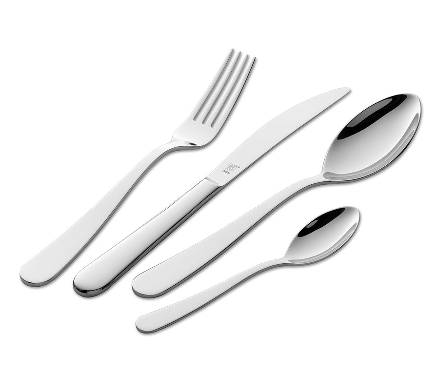 Das 30-teilige Tafelbesteck »Greenwich« besteht aus je sechs Menügabeln, -messern und -löffeln, Kaffeelöffel und Kuchengabeln sind natürlich auch dabei. Das Besteck wurde von Matteo Thun und Antonio Rodriguez exklusiv für ZWILLING® designt und kann mit seiner jugendlich schmalen Silhouette sowie den dezent gebogenen Stielenden punkten. Alle Besteckteile sind aus hochglanzpoliertem Edelstahl gefertigt und ein Besteckkasten ist natürlich auch mit dabei.