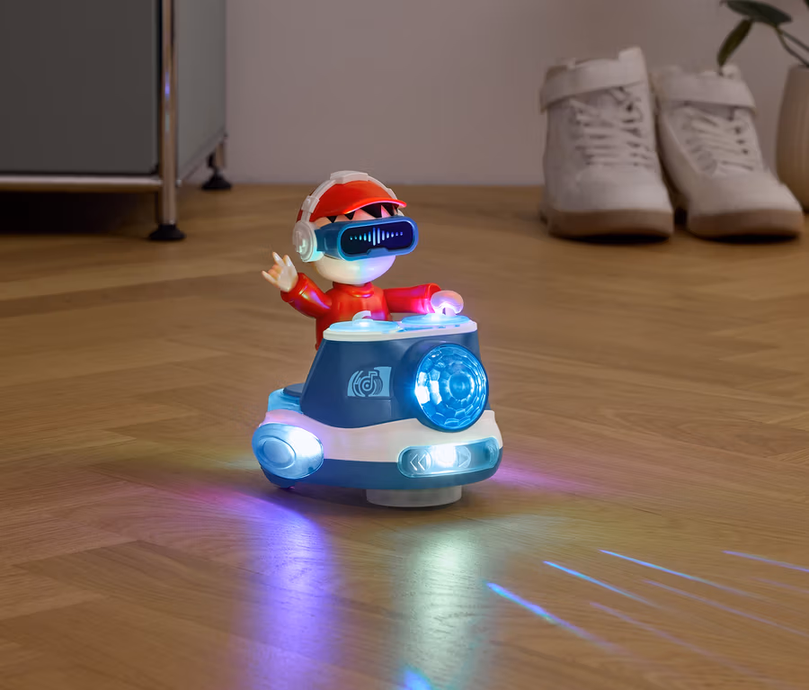 - DJ dreht sich auf Rollen und fährt eigenständig in verschiedene Richtungen (links/rechts)