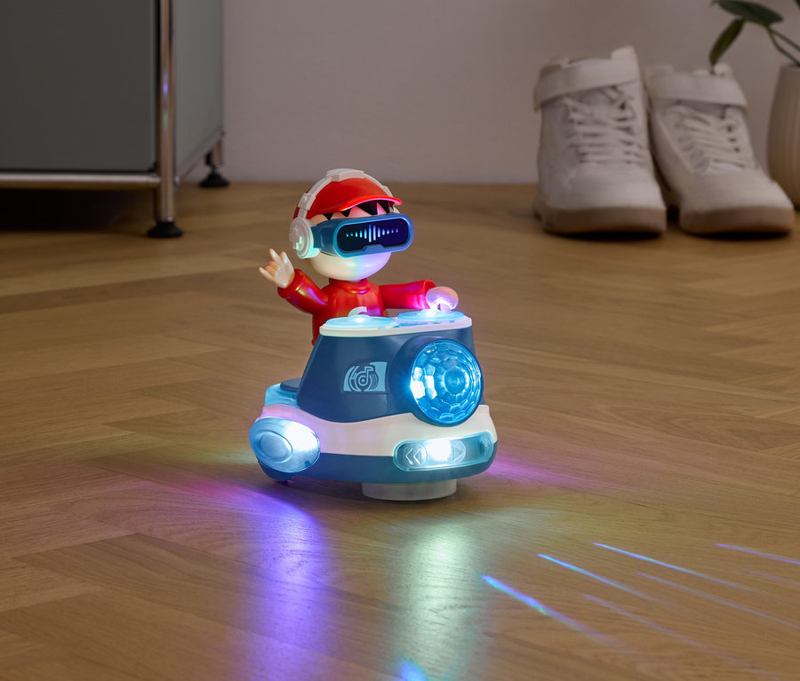 • DJ dreht sich auf Rollen und fährt eigenständig in verschiedene Richtungen (links/rechts)