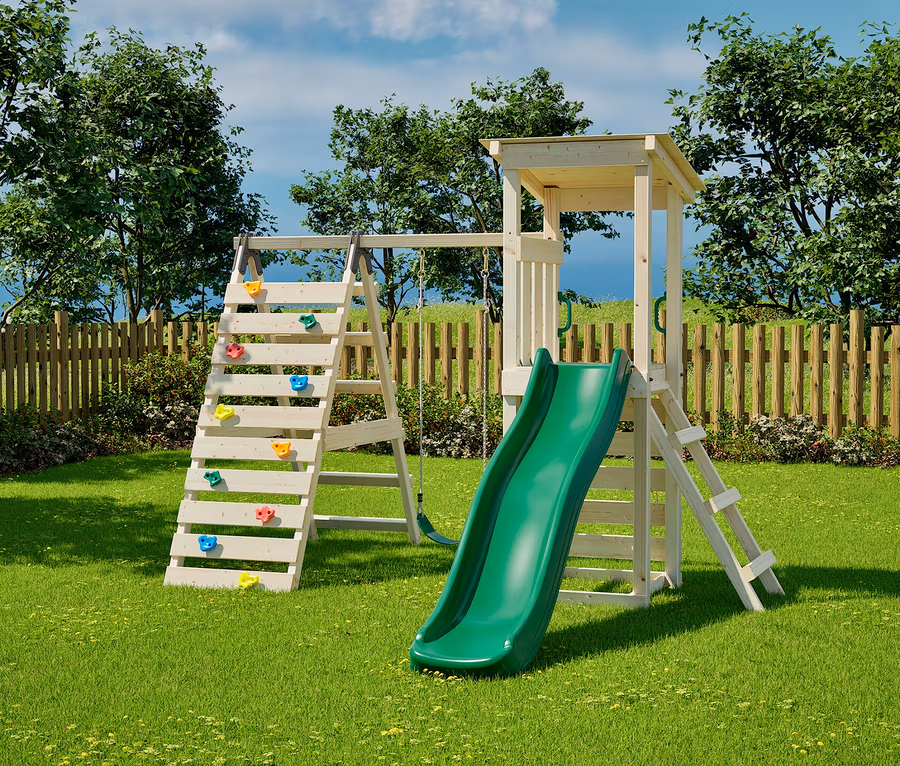 - Mit Schaukel, Sandkasten, Rutsche und 2 Kletterwänden