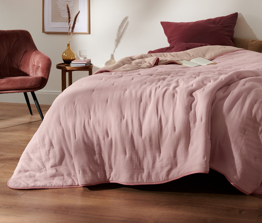 Wunderbar weicher Bettüberwurf in einem unaufdringlichen Roseton, Wendeseite. in zartem beige. So kann man dem Schlafzimmer einen