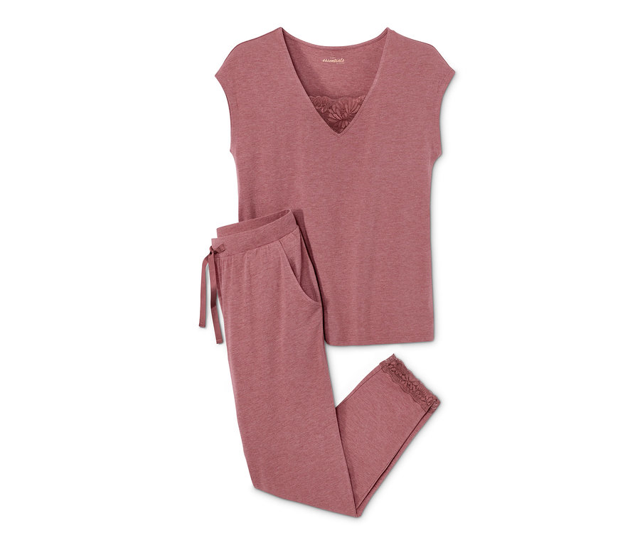 Dieser Pyjama ist fast zu hübsch, um damit einfach so unter der Bettdecke zu verschwinden. Vor allem aber ist er besonders angenehm zu tragen: Dank seiner supersoften Baumwoll-Modal-Mischqualität mit Bio-Baumwolle liegt der Damenschlafanzug wunderbar weich auf der Haut, Elasthan verleiht ihm seine Formbeständigkeit und sorgt für einen perfekten Sitz sowie zusätzlichen Tragekomfort. Die 7/8-Hose hat zwei Eingrifftaschen sowie einen bequemen, elastischen Bund mit Bindeband und ist wie der V-Ausschnitt mit zarter, dekorativer Spitze besetzt. Der ideale Zweiteiler für eine erholsame Nacht – und vielleicht auch für einen entspannten Sonntagmorgen.