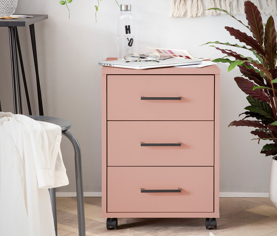 - Auf 4 Möbelrollen, 2 davon mit Feststellbremse für einen sicheren Stand