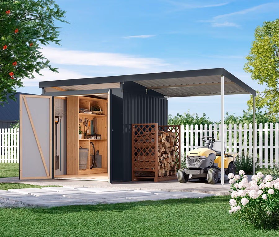 • NEU: modernes Metall-Gerätehaus mit innenliegendem Leimholzrahmen