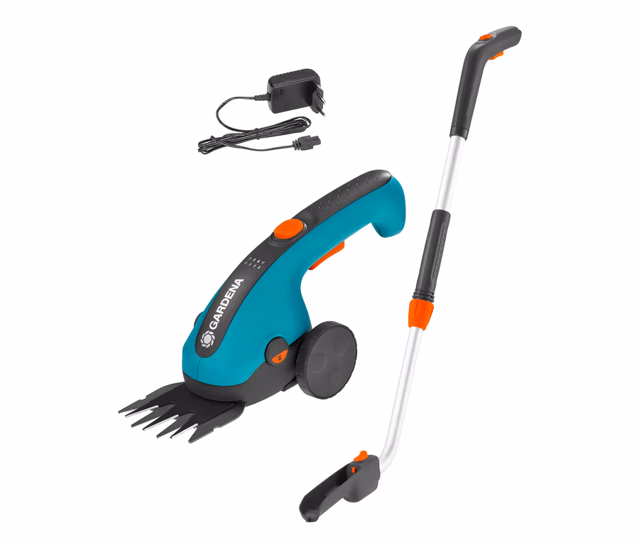 - Inkl. Gras-/Buchsmesser, Rädern, Teleskopstiel, Messerschutz und Ladegerät