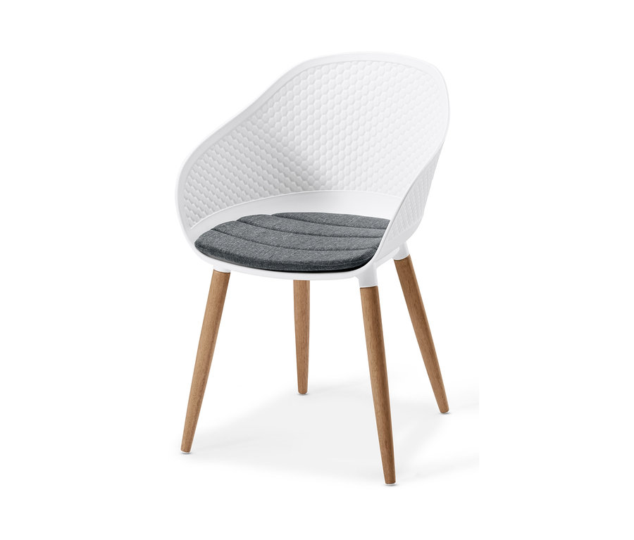 Der Stuhl hat eine Sitzschale aus hochwertigem Duresin® mit geprägter Struktur und die Beine sind aus lackiertem, FSC®-zertifiziertem Eukalyptusholz gefertigt. Dadurch ist das Gartenmöbel UV- und witterungsbeständig.