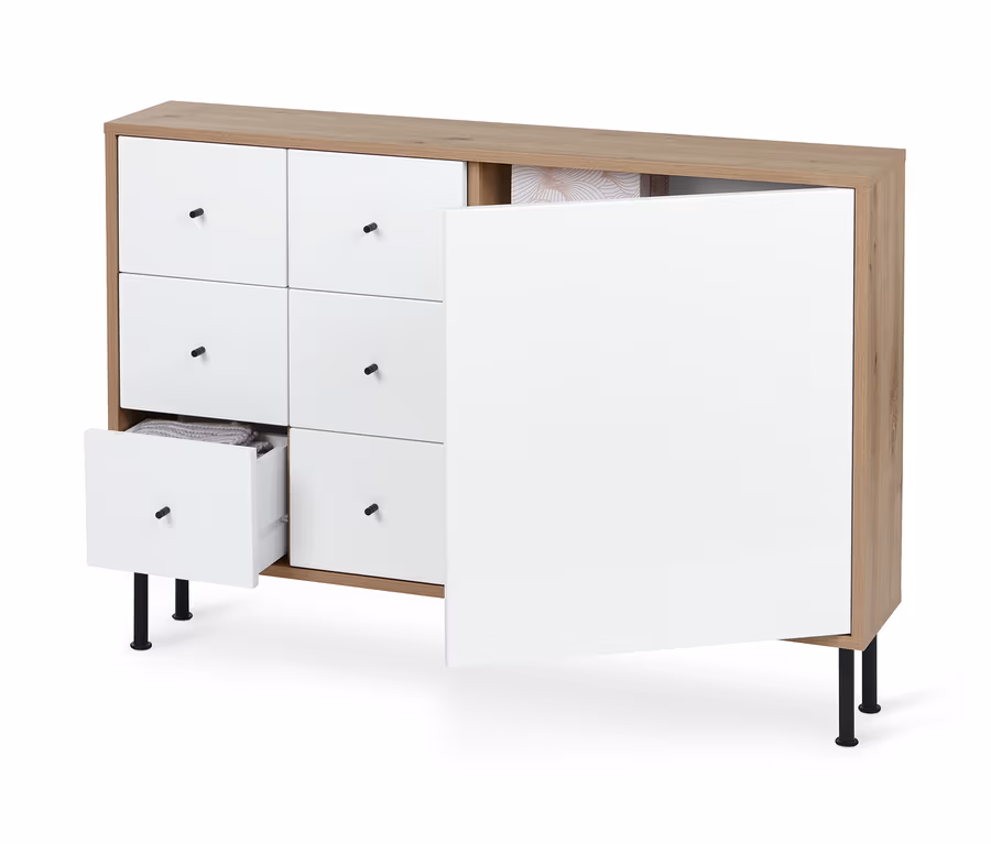 - 6 Schubladen mit hochwertigen, matt schwarzen Metallgriffen