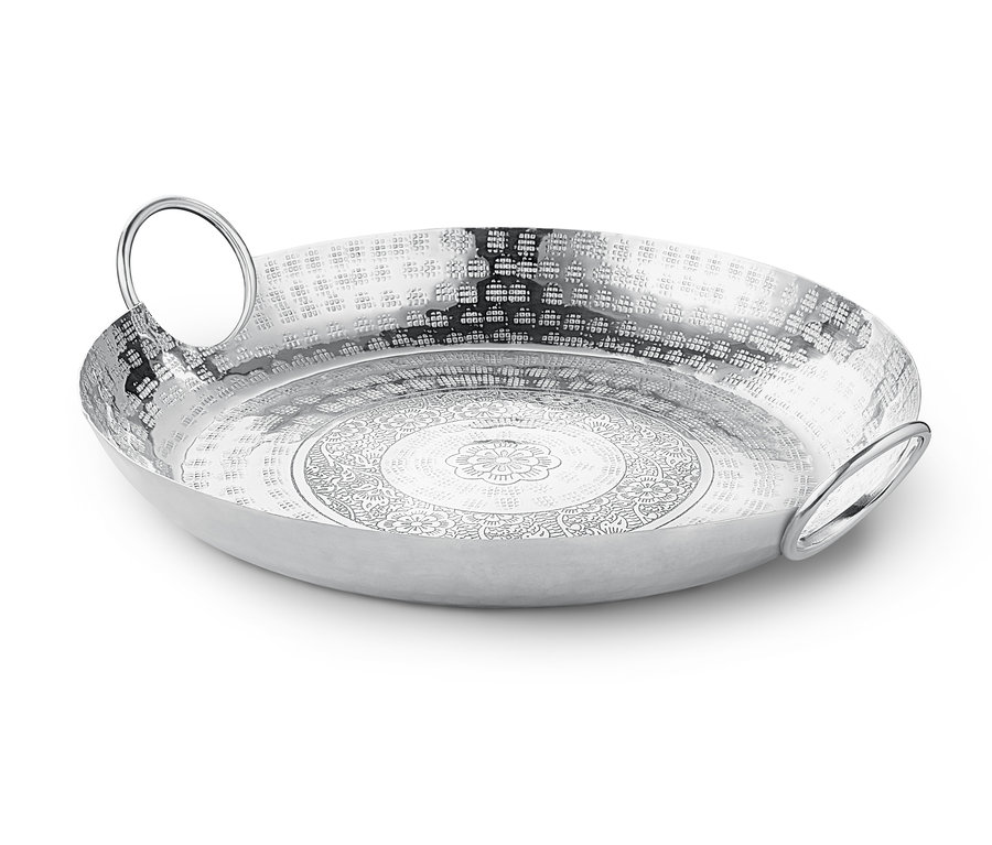 Diese Dekoschale aus poliertem Aluminium ist wunderbar zum Aufbewahren und Servieren von Obst, Keksen oder anderen leckeren Kleinigkeiten geeignet – und andererseits fast zu schade dazu. Mit ihrer gehämmerten Optik, dem aufwändigen Ornamentmuster und den eingearbeiteten Griffen ist sie ein echter Eyecatcher auf dem Tisch oder der Kommode, wie es sich für ein handgearbeitetes Unikat gehört. Drei Silikonpunkte auf der Unterseite schützen auch empfindliche Möbeloberflächen.