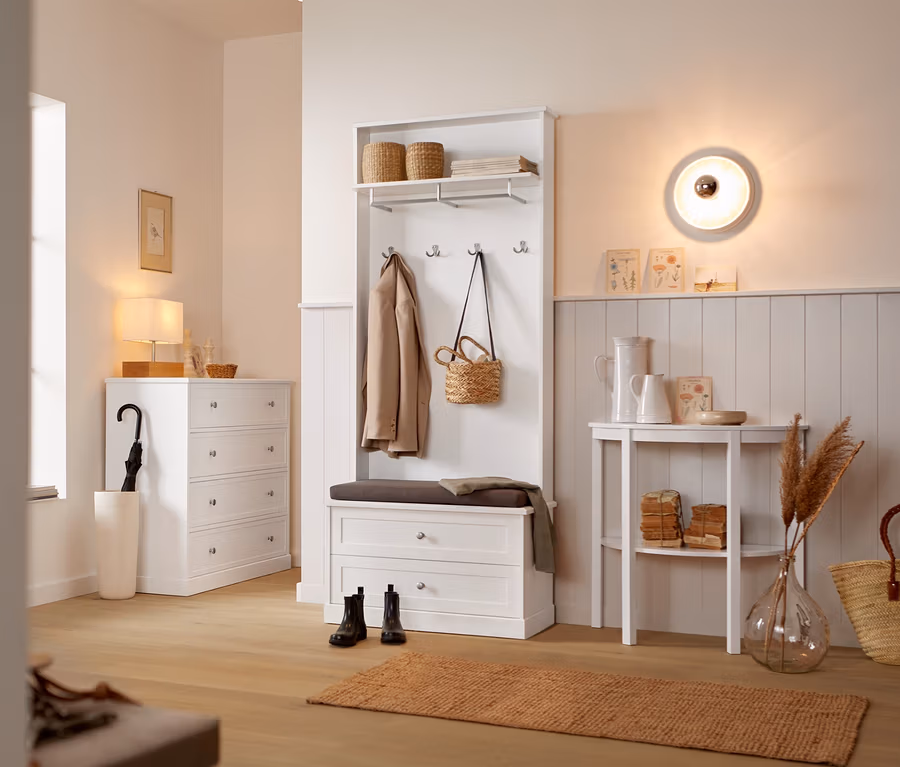 Offener Stauraum hat den Vorteil, dass er nicht so raumgreifend ist und optisch eine gewisse Leichtigkeit ausstrahlt. Das kann besonders wirksam in schmaleren Räumen, im Flur oder im Eingangsbereich sein – und bei dieser Anrichte kommt noch ihre geringe Tiefe hinzu. Das halbrunde Möbel ist im zeitlosen Landhaus-Stil mit Buchen-Massivholz gefertigt und bietet auf der Tischplatte und auf einer tiefer liegenden Ablage Platz für Accessoires, für Ordnungsboxen oder einfach für eine schöne Dekoration. Die Bodenschoner sorgen dafür, dass man den Halbtisch auch auf empfindlicheren Böden wie Parkett platzieren kann.