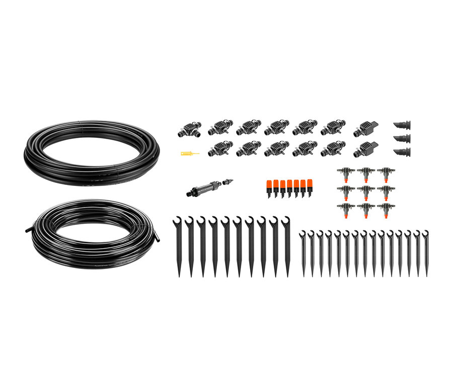 - Inkl. Basisgerät, Verlegerohr, Verteilerrohr, T-Stück, 7 regulierbaren Endtropfern, 9 Reihentropfern, 10 Reduzier-T-Stücken, 5 Verschlusskappen, 25 Rohrhaltern und 1 Reinigungsnadel