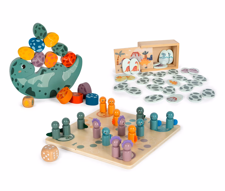 - Memo: 14 kindgerechte Memo-Spielsteine in Form von Dino-Eiern mit Dinosaurier-Motiven, inkl. Holzbox zum Verstauen