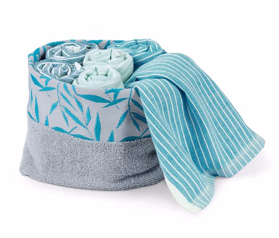 Mit diesem Set aus sechs Gästehandtüchern in modernen, frischen Farben ist man für jede Gelegenheit perfekt gewappnet. Das Handtuch-Set kommt in einem dekorativen Korb, in dem die Handtücher wie im Sternerestaurant einzeln zusammengerollt auf die Gäste warten. Die Handtücher sind aus reiner Bio-Baumwolle gefertigt und besonders saugfähig. Da kann der Besuch kommen!