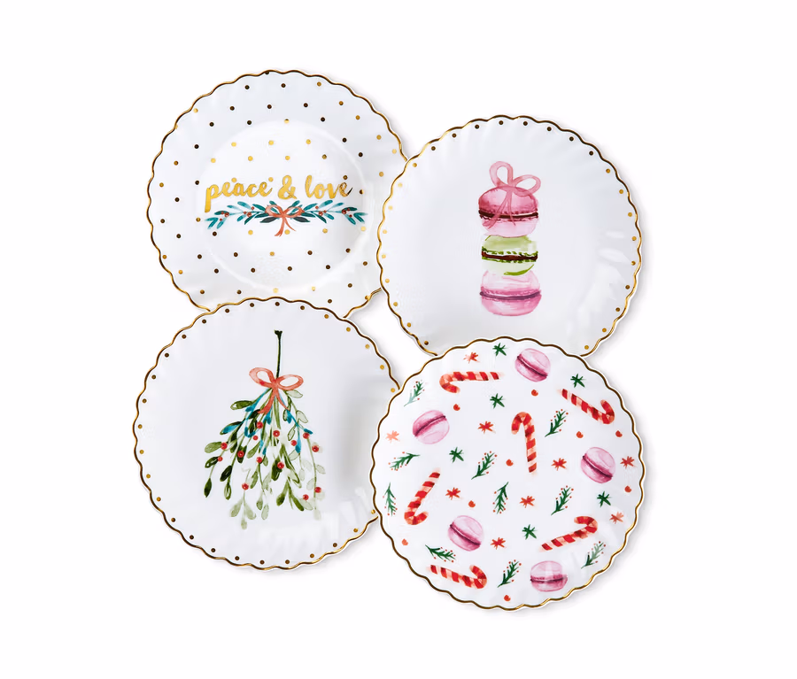 Mit diesen vier Desserttellern kommt bei Tee und Stollen weihnachtliche Stimmung auf. Die Teller haben jeweils einen Durchmesser von etwa 16 Zentimetern und vier liebevoll gestaltete Aquarell-Motive. Zusätzlich sorgt das Glanzgolddekor für schillernde Details.