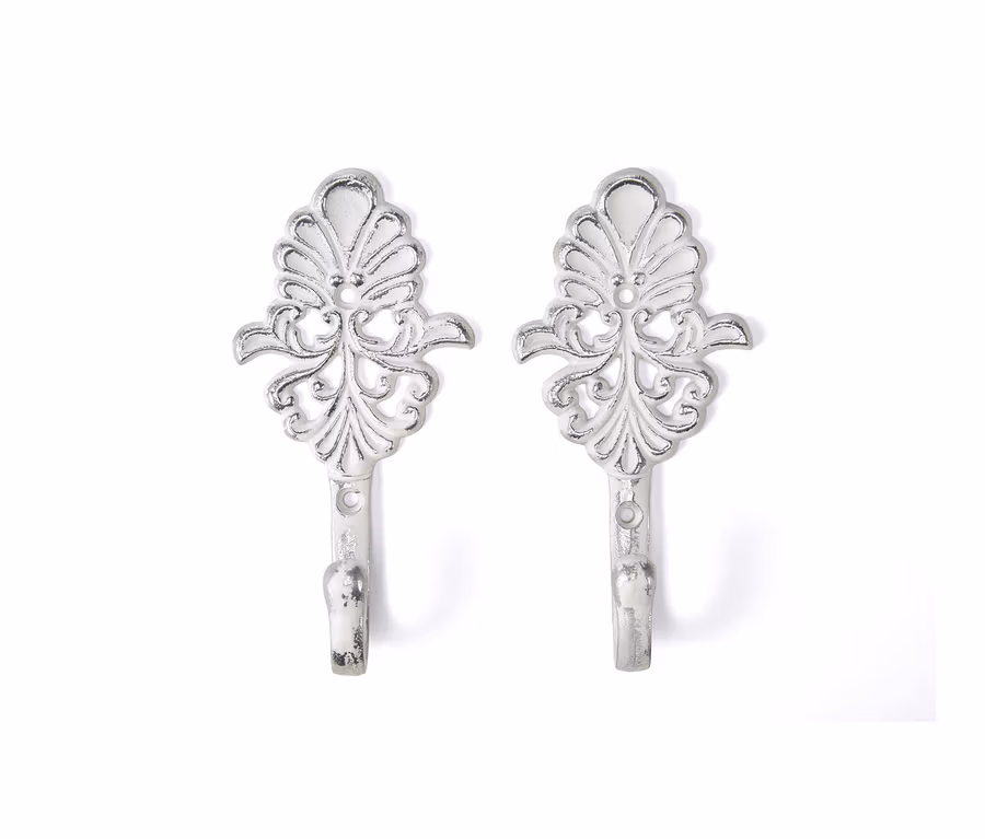 Kleine Details mit großer Wirkung: Diese beiden Wandhaken bieten willkommenen Platz für Jacken, Taschen, Hüte oder andere Accessoires und setzen mit ihrem stilvollen Ornamentdesign hübsche Akzente. Die Garderobenhaken sind aus leichtem Aluminium gefertigt und lassen sich mit dem beiliegenden Montagematerial ganz einfach anbringen.