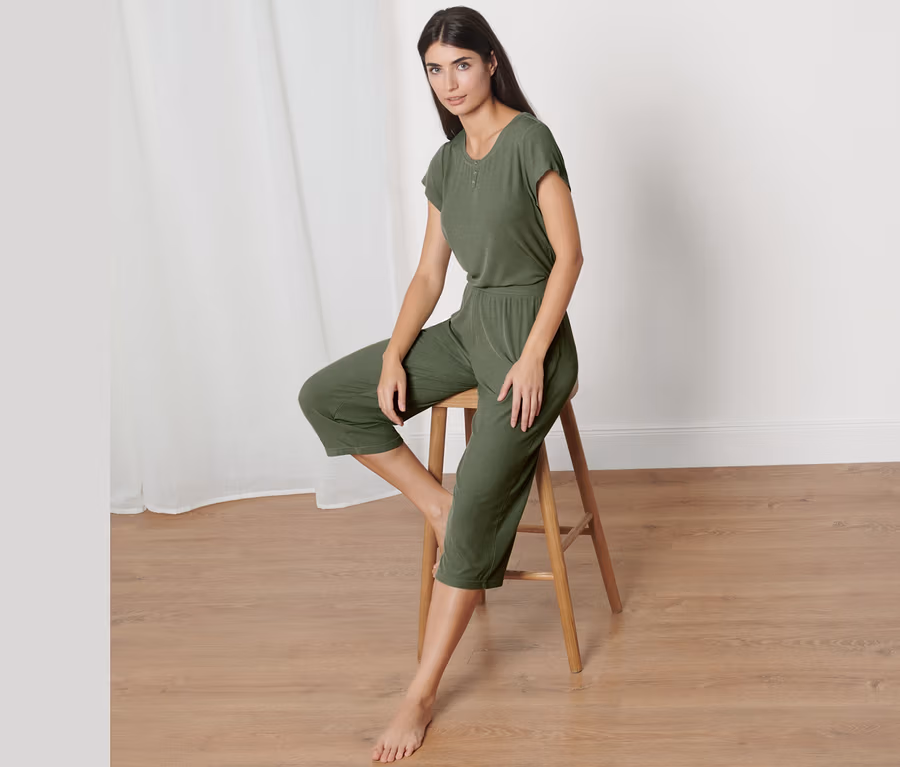 - Dieser Pyjama beinhaltet Fasern aus nachhaltigem Holz.
