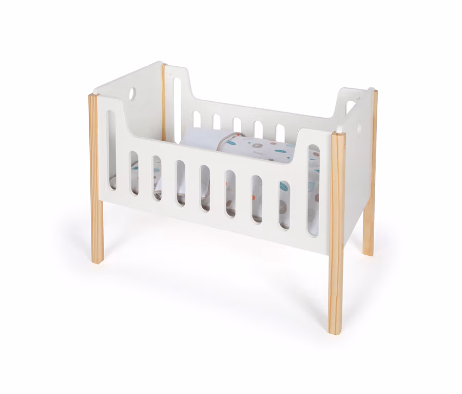 - Skandinavische Geradlinigkeit, zurückhaltende Farbgebung und wiederkehrende Gestaltungselemente der Puppenmöbelserie »Little Button« von small foot ergeben harmonisches Gesamtbild