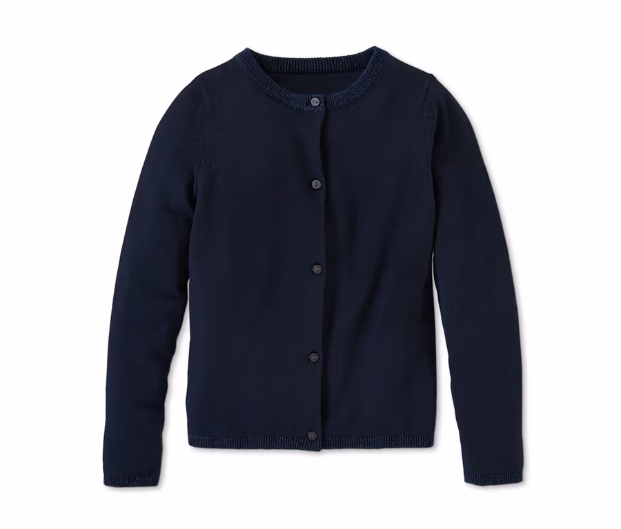 Ob lässig oder festlich: Diese Feinstrickjacke für Kinder geht einfach immer. Mit ihrem schlichten Look kann sie zu jedem Outfit kombiniert werden – dabei setzen die Rippbündchen an Halsausschnitt, Ärmel und Bund wunderbare Akzente mit blau-silberglänzendem Garn. Durch ihren hohen Baumwollanteil fühlt sich die Strickjacke dazu noch richtig gut auf der Haut an.
