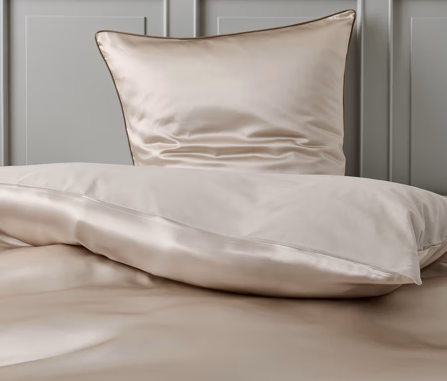 Die Seidenbettwäsche macht einen wertigen Eindruck, die Farbe beige schimmert je nach Lichteinfall in beige bis leicht golden und