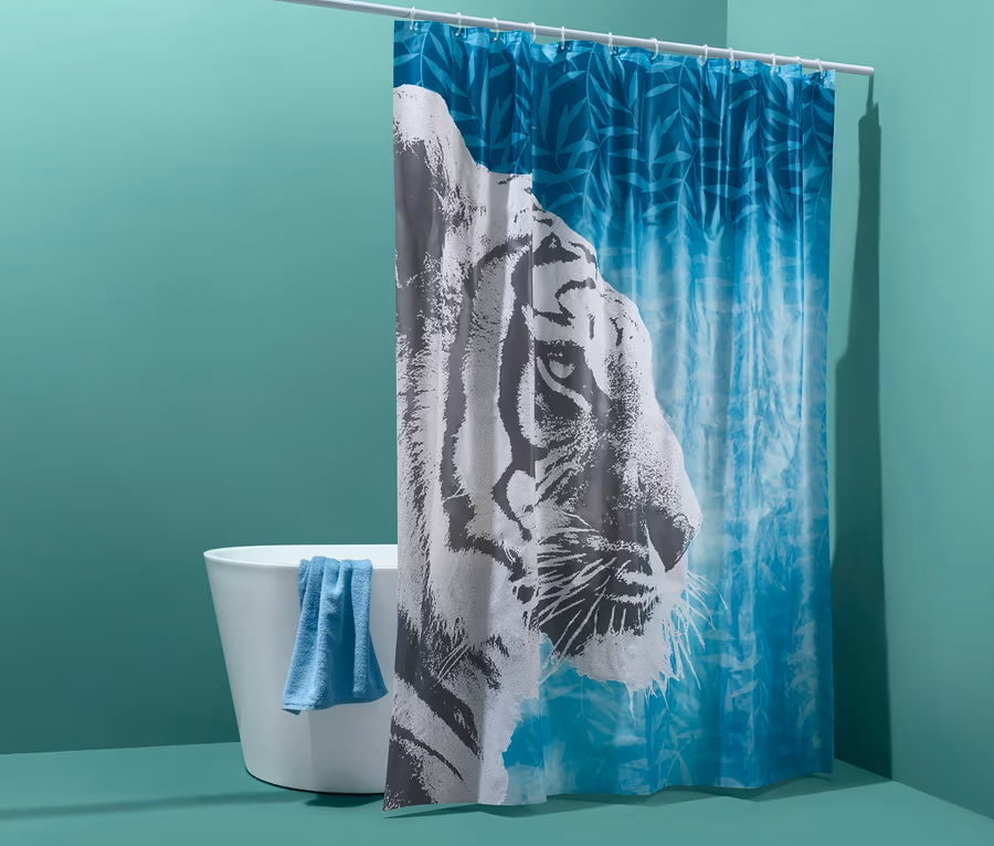 Im Bad ist der Tiger los – jedenfalls mit diesem Duschvorhang, der echtes Tropen-Feeling in das Badezimmer bringt. Neben der tollen Optik in der Trendfarbe Türkis überzeugt er aber auch mit bester Funktionalität. Der zuverlässig wasserdichte Vorhang ist aus hochwertigem Kunststoff ohne Weichmacher gefertigt und mit zwölf Kunststoffringen ausgestattet. Einfach aufhängen und ab jetzt mit Tiger duschen!