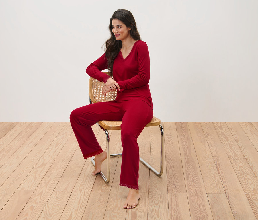- V-Ausschnitt, Ärmelabschlüsse und Beinabschlüsse mit zartem Spitzenbesatz