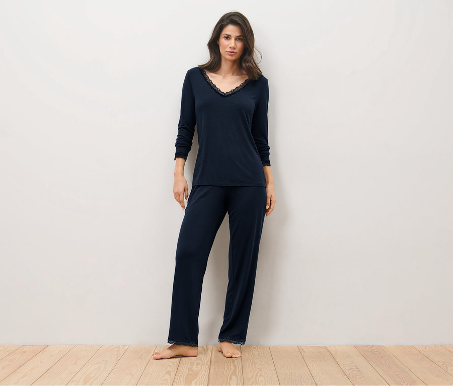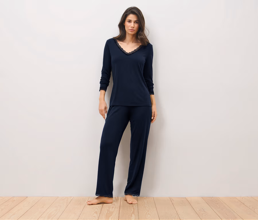 Pyjama-Set mit Spitzenbesatz, dunkelblau