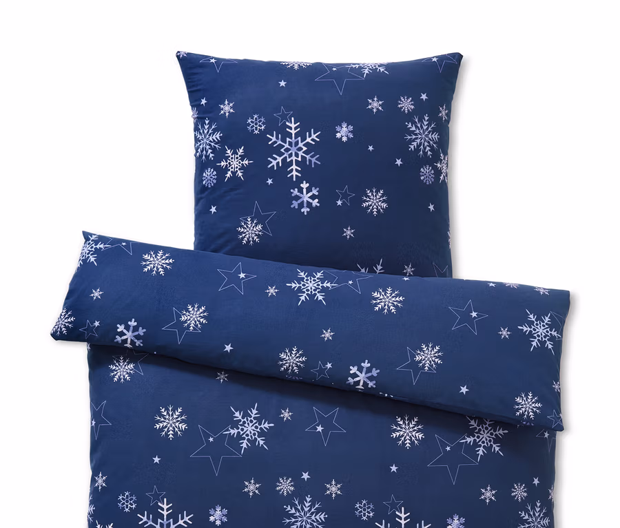 Weiche und leicht angeraute Baumwolle für die Extraportion WärmeDer Winter wird kuschelig, denn in dieser dunkelblauen Biber-Bettwäsche mit Schneeflocken-Print kommen einem die kühlen Tage auf einmal recht warm vor.