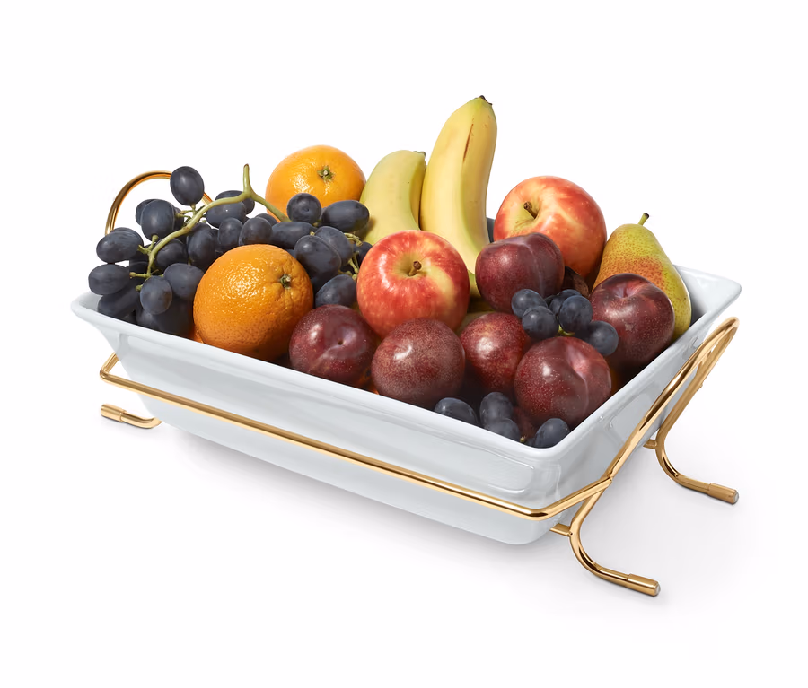 - Auflaufform mit goldfarbenem Metallgestell