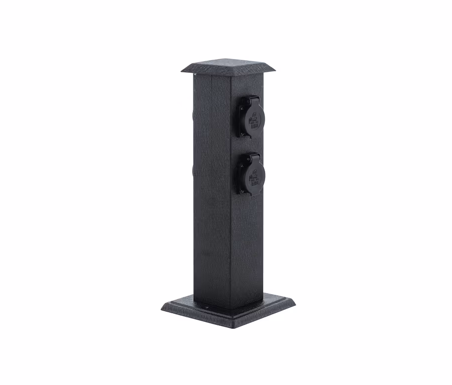 - Steckdosensäule mit 4 schwarzen Kunststoff-Steckdosen mit Klappdeckel und Spritzwasserschutz