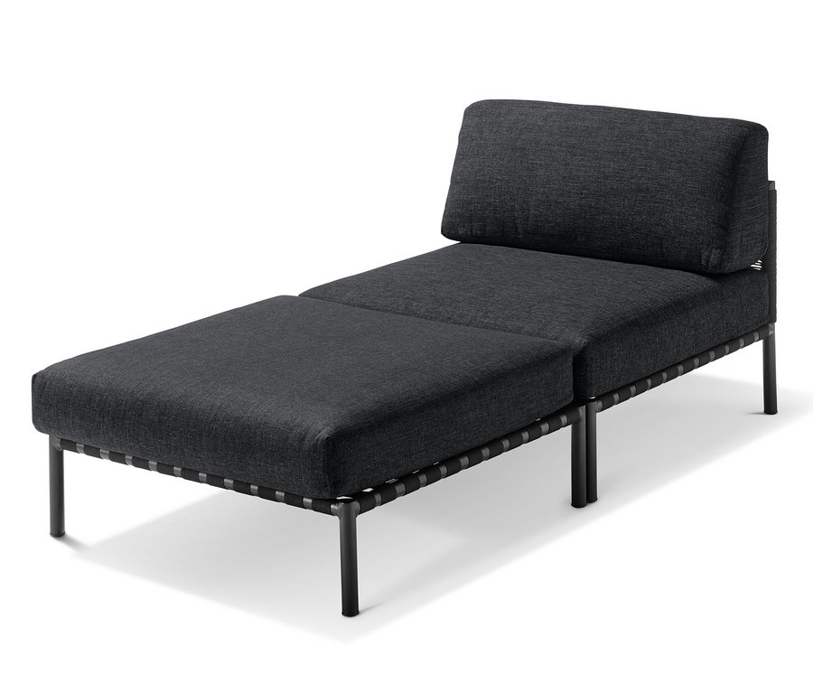 Die beiden Sitzkissen sind schön dick und angenehm weich – für einen besonders hohen Komfort, der durch das Rückenkissen in Keilform noch erhöht wird. Das Textilbandgeflecht ist ebenso stylisch wie outdoortauglich, die Bezüge lassen sich abnehmen und in der Maschine reinigen. Der Rahmen ist aus pulverbeschichtetem, rostfreiem Aluminium gefertigt und trägt seinen Teil zur UV- und Witterungsbeständigkeit der Möbel bei. Dank der Bodenschoner lassen sich Sessel und Hocker auch auf empfindlicheren Untergründen bedenkenlos aufstellen.