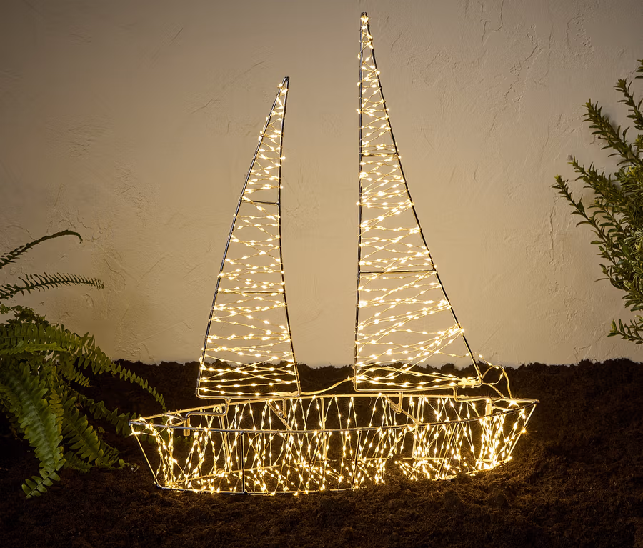 • Metallsilhouette in Bootsform, umwickelt mit Lichterkette