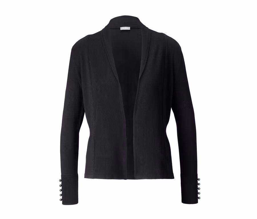 Ob zum eleganten Kleid oder zur schlichten Jeans: Diese Feinstrickjacke passt zu jedem Kleidungsstück. Mit ihrem fließend fallenden Stehkragen und dem dekorativen Perlenbesatz am Ärmel ist sie sowohl klassisch als auch modisch.