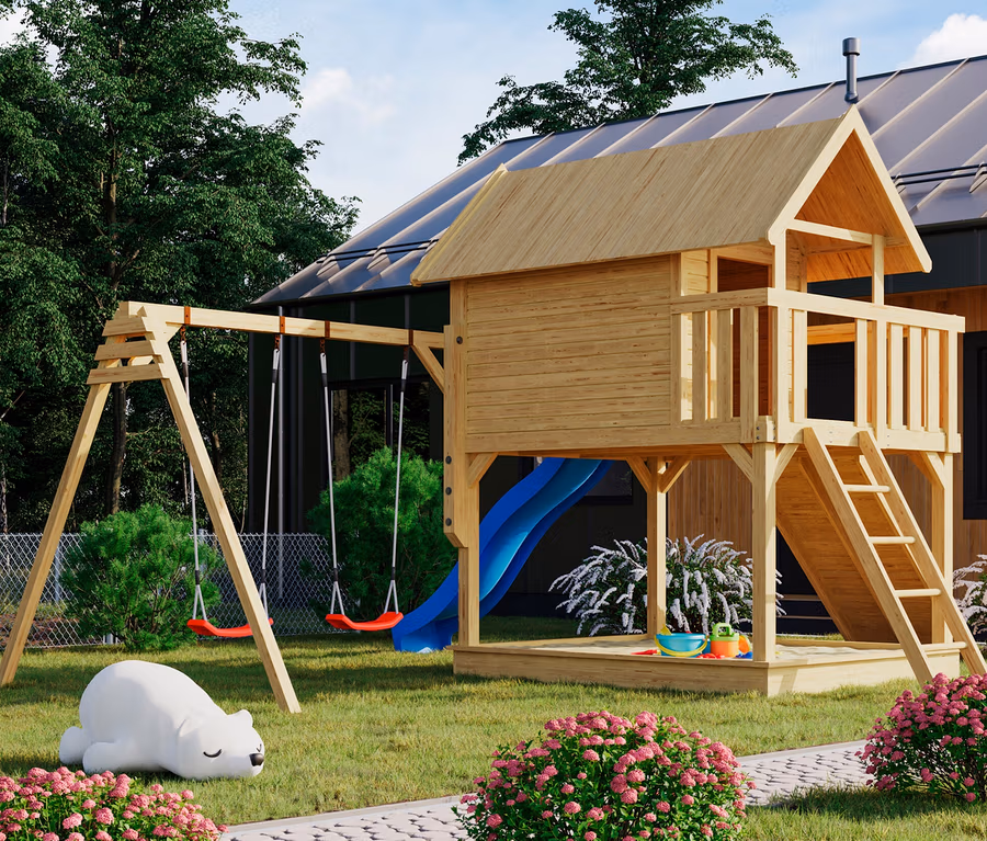 - Mit Wellenrutsche, Holzleiter und Doppelschaukel