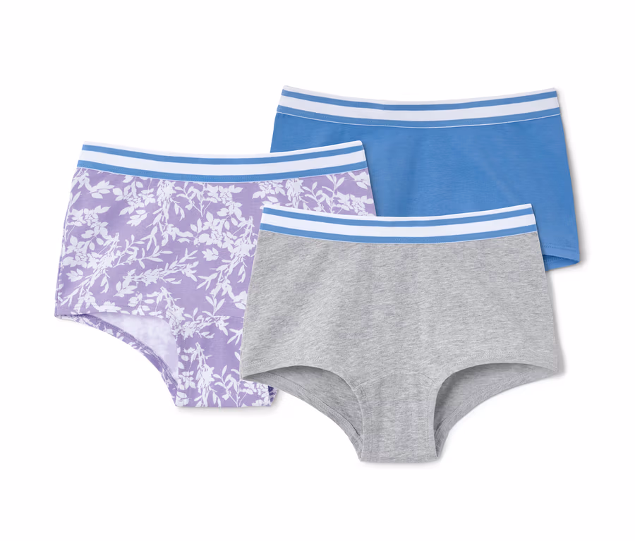 - 1x lila-weißer Alloverprint, 1x grau meliert, 1x mittelblau, jeweils mit blau-weiß gestreiftem Bündchen