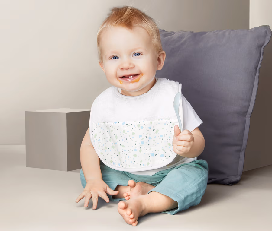 Lecker und verkleckert: Beim Füttern von Babys kann schon einmal etwas danebengehen. Wer jedoch nicht nach jedem Mahl die Kleidung der Kleinen waschen möchte, der kann auf diese Lätzchen setzen. Doppellagig verarbeitet und mit einem Klettverschluss am Hals versehen, sind sie leicht anzuziehen und sehr robust. Sie bestehen zudem aus Bio-Baumwolle und sind jeweils mit einem bunten Terrazzo-Print und einer blauen Ente versehen.