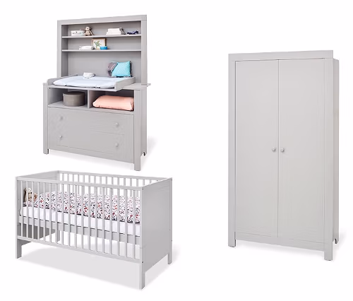 Dreiteiliges Babyzimmer »Liv« mit einem extrabreiten Regalaufsatz, einem Kinderbett, einer Wickelkommode mit Wickel- und Regalaufsatz und einem zweitürigen Kleiderschrank mit zwei höhenverstellbaren Einlegeböden und einer Kleiderstange. Die ideale Erstausstattung für ein stilvolles Kinderzimmer in grauem Dekor. Der extrabreite Regalaufsatz ist mit im Lieferumfang enthalten und bietet viel zusätzlichen Stauraum für Kleidung, Accessoires und Spielsachen. Drei Schlupfsprossen am Kinderbett ermöglichen Kindern einen leichten und sicheren Ein- und Ausstieg. Der Wickelaufsatz der extrabreiten Wickelkommode ist abnehmbar, sodass diese sich nach der Wickelzeit als tolles Sideboard weiter nutzen lässt.