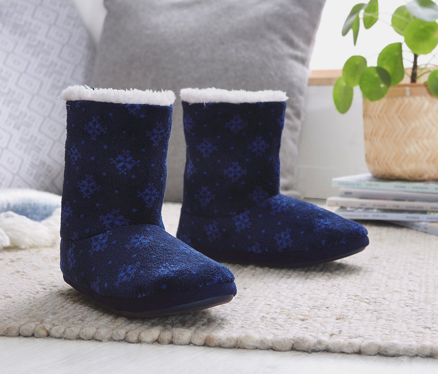 Auf kuscheligen Sohlen durch den Winter: Diese Hausschuh-Stiefel mit angenehmem Futter aus Plüsch sind ausgesprochen weich und wärmend. Sie können umgeschlagen oder auch mit langem Schaft getragen werden – und passen sich damit individuell den Bedürfnissen ihres Trägers an. So wunderbar, so warm: Bei diesen Hausschuhen erinnert allein das schicke Schneeflocken-Dessin an die Kälte der Saison.