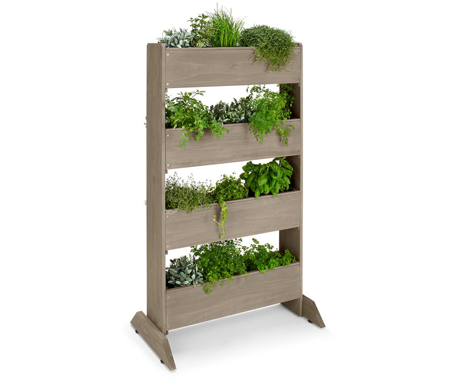 Das Möbel hat vier Pflanzkästen und eignet sich besonders für rankende Pflanzen wie Efeu oder Erdbeeren – so lässt sich auch ein dekorativer Sichtschutz schaffen. Gefertigt ist das Möbel aus imprägniertem, UV- und witterungsbeständigem Massivholz und die Bodenplatten haben ein leichtes Gefälle. Wodurch Staunässe verhindert wird. Mit den höhenverstellbaren Standfüßen lassen sich leichte Unebenheiten ausgleichen.