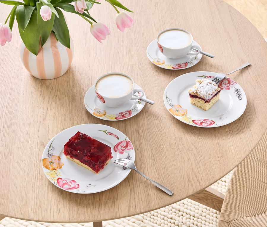 - Inkl. 2 Tellern, 2 Tassen, 2 Untertassen, Merkblatt für die Benutzung von Mikrowelle und Backofen und Merkblatt zur Konformität