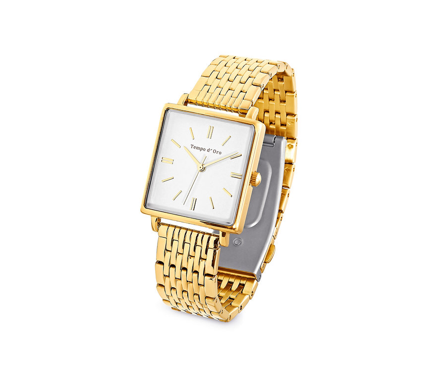 - Quarzwerk mit Stunden-, Minuten- und Sekundenzeiger. Das Armband hat 8 herausnehmbare Bandglieder mit Klappmechanismus