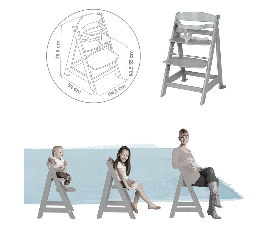 • Wächst nach einfacher Abnahme von Schutzbügel und Gurtsystem durch das höhenvariable, herausnehmbare Sitz- bzw. Fußbrett stufenweise zum Jugendstuhl heran