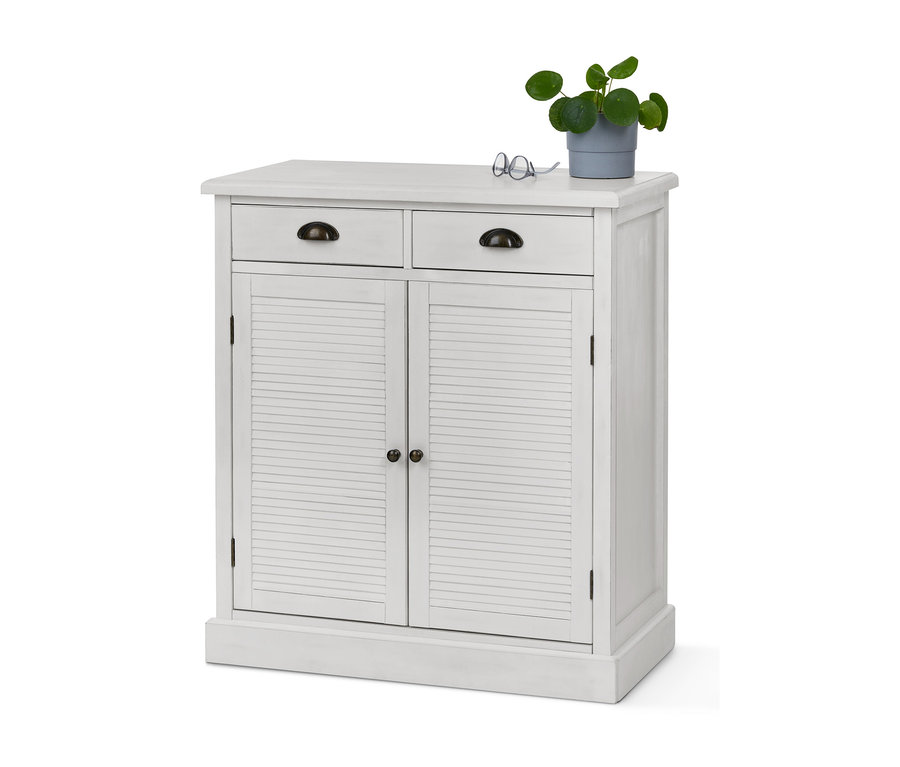 Diese weiß lackierte Kommode bietet nicht nur viel Stauraum, sondern macht mit ihren Lamellentüren und den Griffen aus bronzefarbenem Metall auch dekorativ richtig etwas her. Korpus und Türrahmen bestehen aus Kiefern-Massivholz. Dieses verleiht der Kommode sowohl einen natürlich holzigen Charakter als auch Robustheit. Die zwei Schubladen werden ergänzt durch die Türen, hinter denen sich jeweils ein Einlegeboden verbirgt. Um an jedem Standort den Fußboden zu schützen, sind Bodenschoner inklusive.