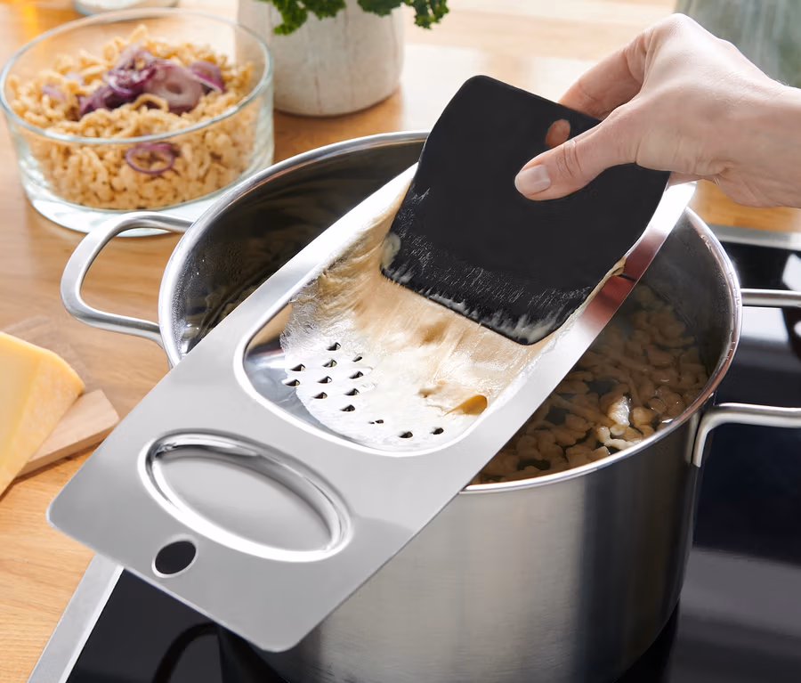 - Inkl. flexiblen Spätzleschabers zum komfortablen Verstreichen des Teiges