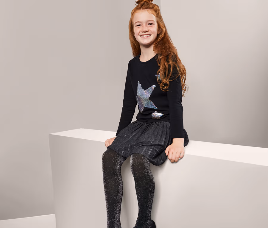 Da funkeln nicht nur Kinderaugen: Diese Feinstrickstrumpfhosen mit eingearbeiteten Glitzerfäden sind der absolute Hit. Ihre glitzernden Fäden und die blaue oder schwarze Farbe garantieren, dass jedes Outfit zu einem glitzernden Highlight wird. Und auch das Tragegefühl kommt hier nicht zu kurz: Die weich angeraute Innenseite und der elastische Bund fördern einen guten Sitz, der die ein oder andere Spiele-Aktion locker mitmacht.