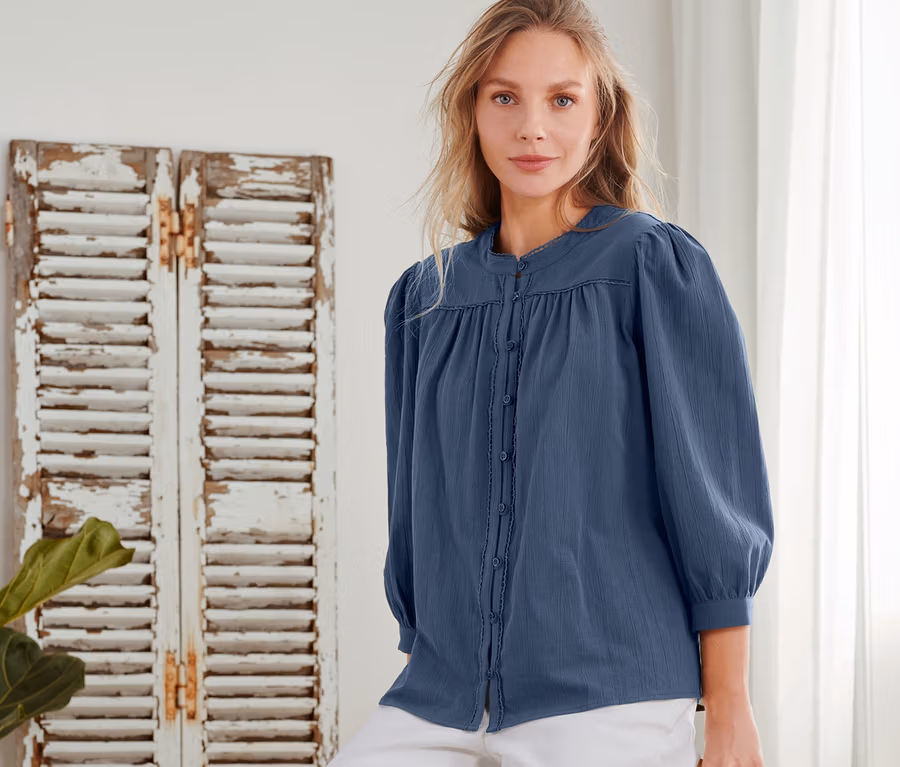 - Dezente Lochstickerei an Auschnitt, Schulterpartie und Knopfleiste
