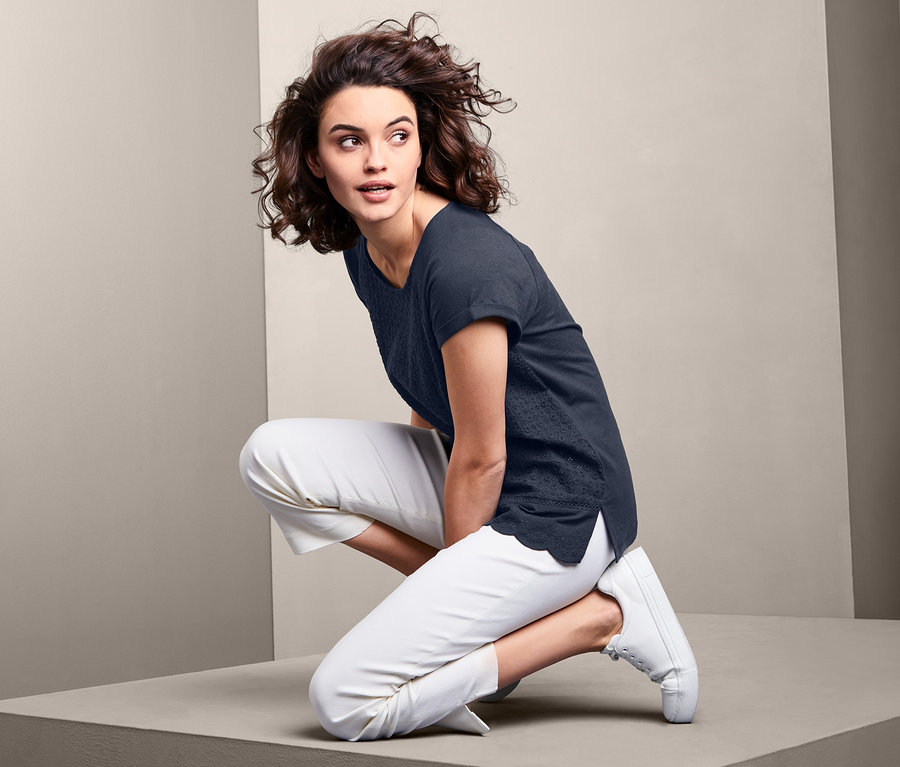 Das Damenshirt mit Rundhalsausschnitt ist auf der Vorderseite mit einer schicken Lochstickerei in zwei Größen versehen und die kurzen Raglanärmel haben einen fixierten Umschlag. Eine Wellenkante ziert den Saum und Seitenschlitze bieten optimale Bewegungsfreiheit.