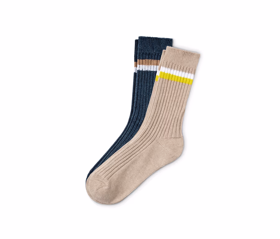 - 1x beige meliert mit weiß-gelbem Kontraststreifen, 1x dunkelblau meliert mit weiß-beigem Kontraststreifen