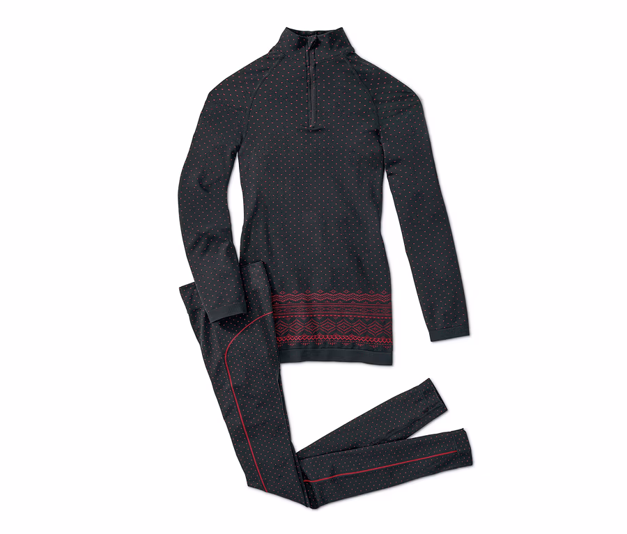 Die lange Unterhose ist wie das langärmlige Oberteil mit modischem Norweger-Einstrick gearbeitet und beide Teile haben Flatlocknähte – für ein besonders angenehmes Tragegefühl. Das Oberteil hat einen Stehkragen und einen Reißverschluss mit Kinnschutz, seine Raglanärmel verschaffen der Trägerin optimale Bewegungsfreiheit. Die Unterwäsche ist mit dem Aktivitätsgrad 3 und dem Wärmegrad 1 perfekt für alle aktiveren Wintersportarten geeignet.